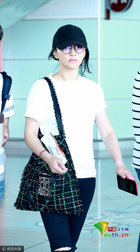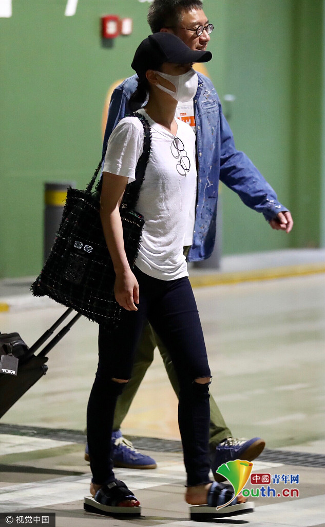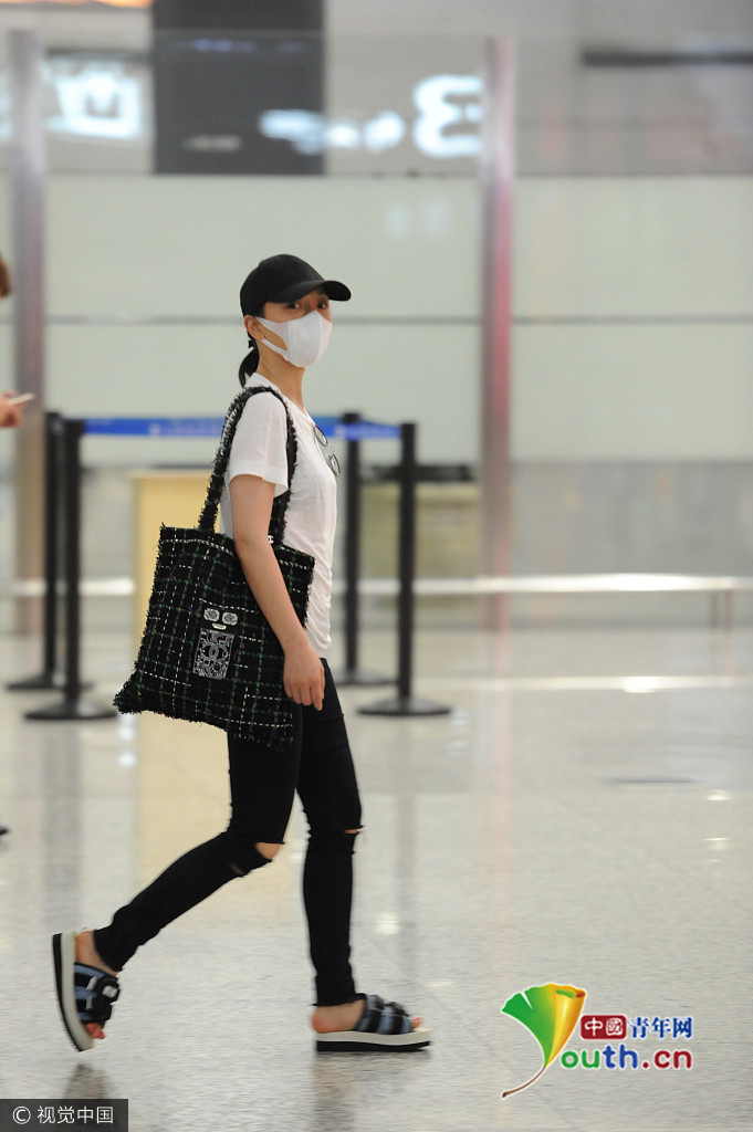 13日,周迅现身首都机场,当天她素颜赶飞机不施粉黛,白色T恤搭配黑色破洞裤休闲随性,踩舒适凉拖鞋现身的她全无明星架子,但举手投足间气质不俗。