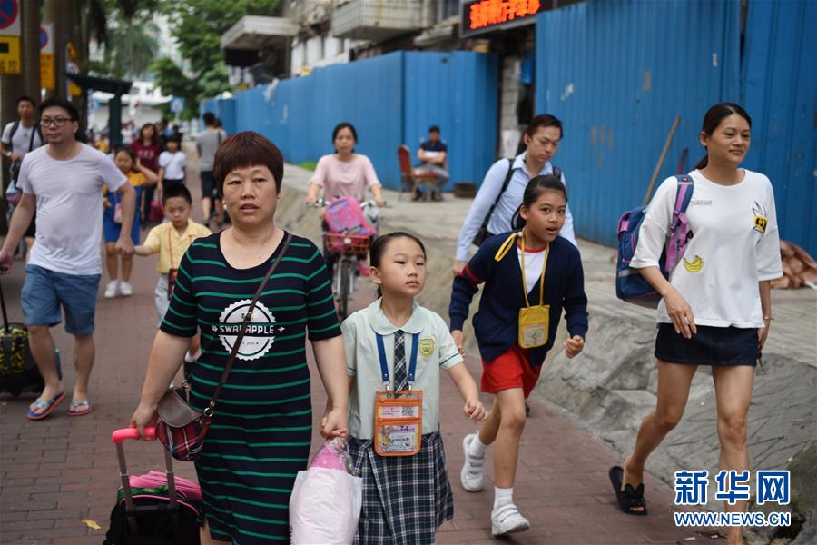 文菡(前左二)和妈妈走在去往福田口岸的路上(5月12日摄)。新华社发(王申 摄)