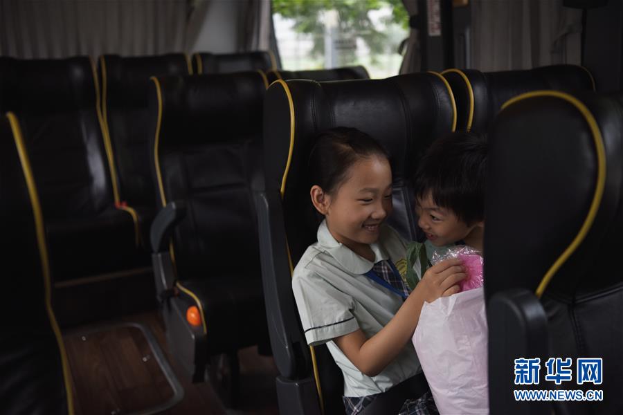 文菡(左)在“校巴”上和同学说悄悄话(5月12日摄)。新华社发(王申 摄)