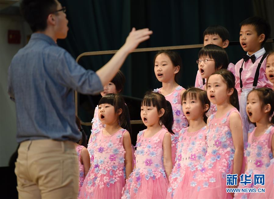 在位于香港东涌的香港教育工作者联会黄楚标学校,文菡(中间排左二)在文艺汇演中演唱《这是我家》(5月12日摄)。新华社发(王申摄)