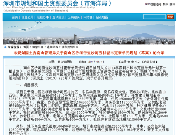 市规划国土委南山管理局关于南山区沙河街道沙河五村城市更新单元规划(草案)的公示