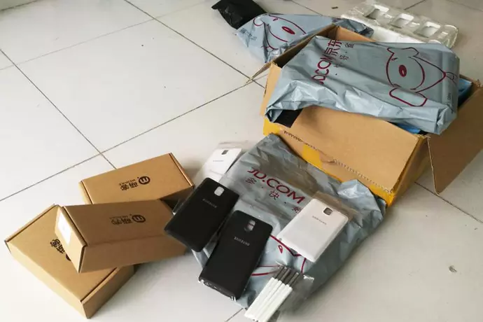 实际上,小米一直是假货的受害者,近几年维权涉案金额更是累计高达3亿元。雷军曾在今年两会期间发言附议马云“像治理酒驾那样治理假货”的呼吁,称小米也深受假货危害。“市面上卖的小米手机中,有30%-40%都是假的,外观一模一样,里面的产品、体验、性能都极差。不仅影响企业收益,还特别影响品牌形象和品质”。图为现场搜出的一大箱京东快递单。
