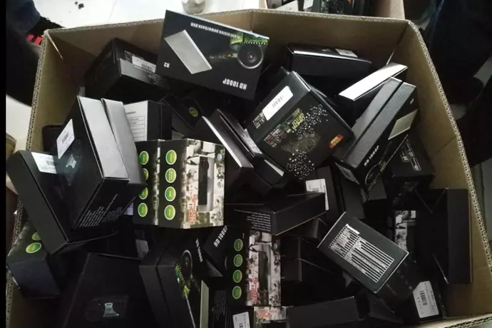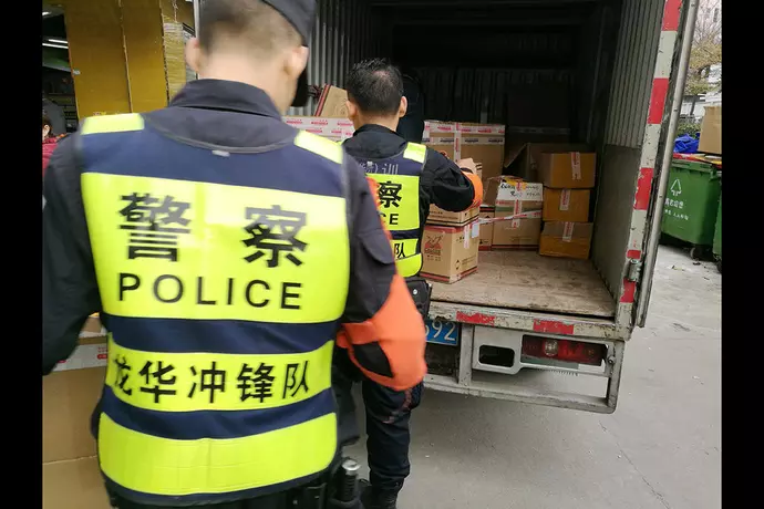 警方现场查获假冒手机壳和电池共计7600余件,正品计算40余万元。这其中包含4000余件假冒小米手机壳和122块假冒小米手机电池。另外,警方还在现场发现1000余件违禁微型偷拍摄影器材,包括偷拍眼镜、手表、钢笔、车钥匙、打火机、钮扣等。图为警方正将从现场查处的假冒手机电池等配件装车。