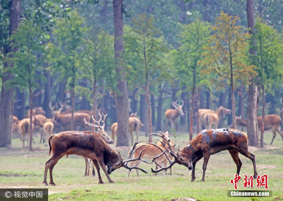 2017年6月18日,江苏大丰麋鹿国家级自然保护区,“鹿王争霸”融媒体现场直播,打斗场面令人震撼。当前,正是麋鹿发情交配季节。麋鹿是一夫多妻的群居动物,通过一对一淘汰对手,最后当上鹿王。图片来源:视觉中国