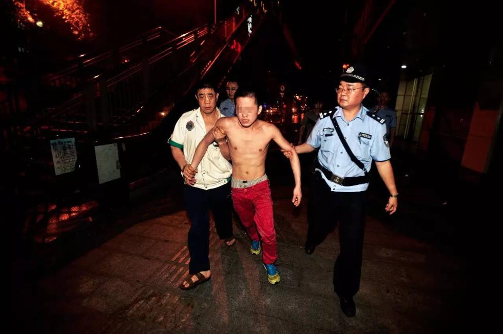 2014年6月28日,重庆沙区沙正街,民警准备将一酒醉男子带回派出所。此前,醉酒男子与人发生纠纷后,冲进火锅店的厨房拿出两把菜刀吓唬人。群众报警后,民警火速赶到现场,将其制服。