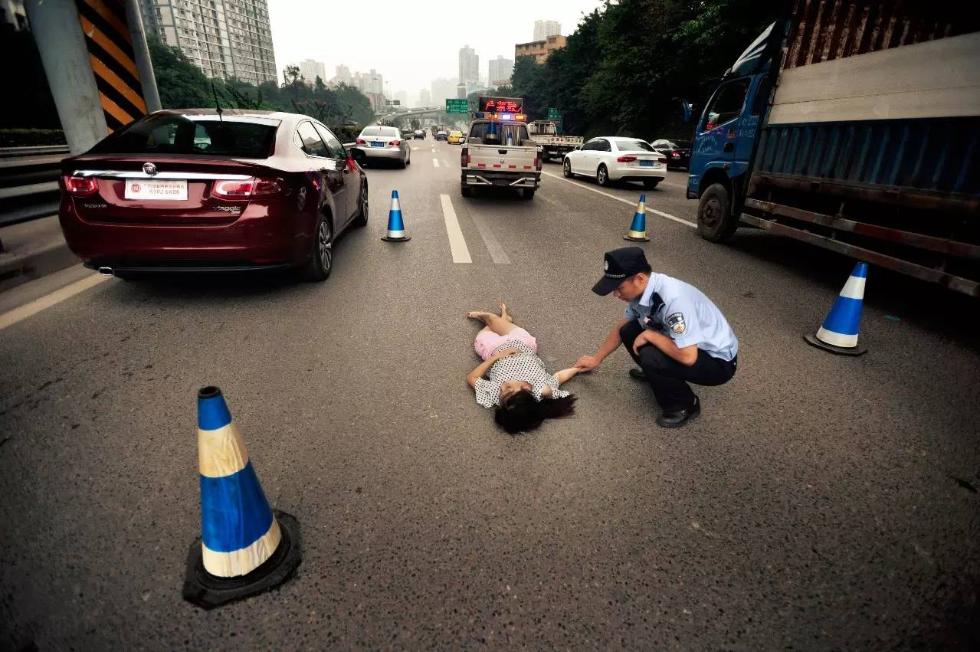 2014年7月15日,重庆,杨公桥高速公路的一座人行天桥上,一女子爬上隔离护栏纵身跳下,重重摔在高速公路上,幸好车辆躲避及时未造成碾压。渝碚路派出所民警赶到现场,在120到来前对女子进行抢救,并站在她周围指挥交通,防止车辆对她造成二次伤害。