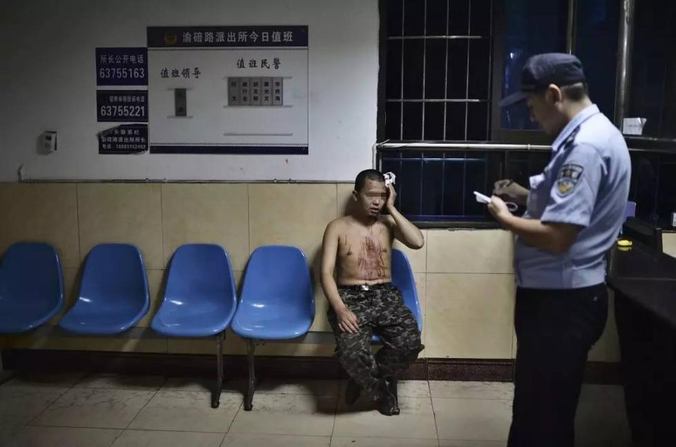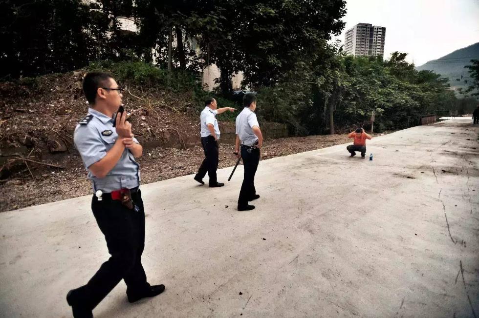 2014年9月2日,重庆,沙区杨梨路附近,民警持枪将一持刀伤人的男子抓获。经了解,男子得知妻子与单位领导有染后,一气之下提刀将领导砍伤。