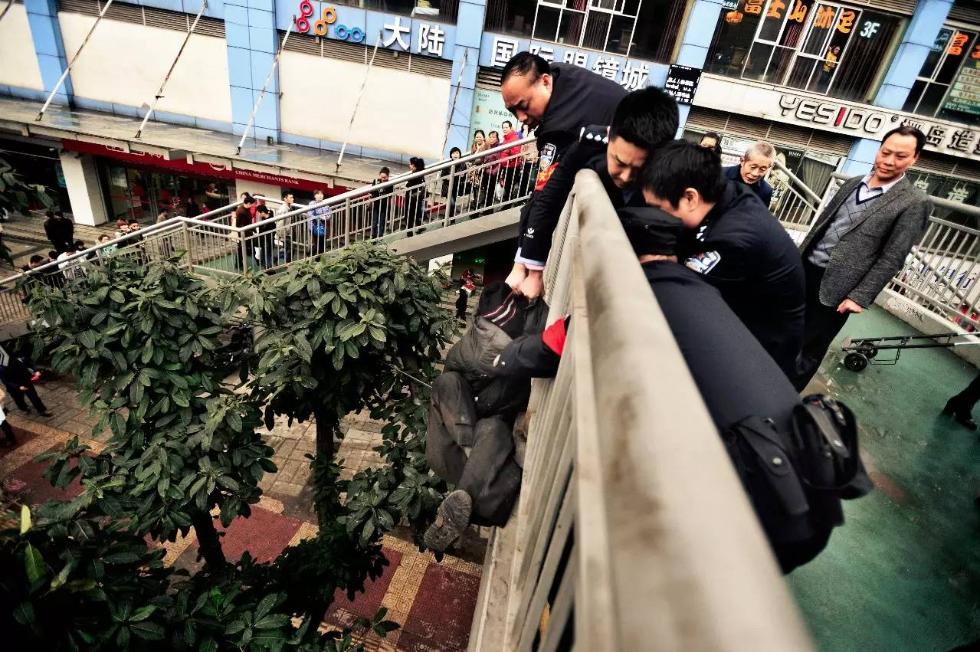 2014年3月24日,16:58 ,重庆沙区天陈路,渝碚路派出所的报警电话瞬间被打爆。报警指向一个事件,有人在沙区天陈路的天桥上要轻生。民警赶到后,一名男子双手抓住护栏,身悬空桥外,民警一边劝解一边拉住他的衣服。突然,警长一声令下,几位民警同时发力将男子拽回。经了解,男子是贵州人,因来渝未找到工作一时想不开。