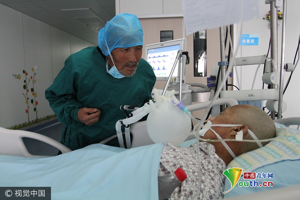 2017年5月18日,兰州,自从52岁的儿子朱绪财突患重症化脓性脑膜炎以来,80岁的老父亲朱令宽立即从老家镇原赶来,日日夜夜守候在重症室门前,等待儿子从昏迷中醒来。探视时间内,老人就会在病房内看望儿子。