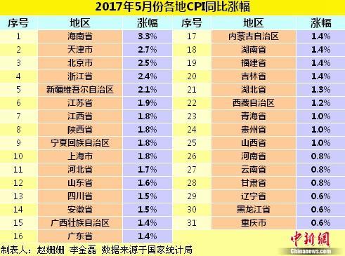 国家统计局近日公布了全国31个省(区、市)5月份居民消费价格指数(CPI)。数据显示,28个省份5月份CPI同比涨幅较4月份出现不同程度扩大。其中,海南省5月份CPI涨幅迈入“3时代”,为全国最高。