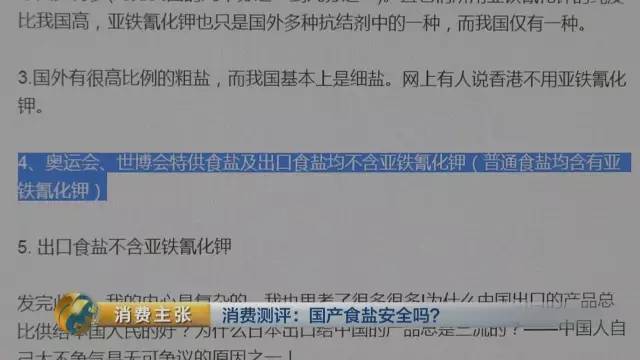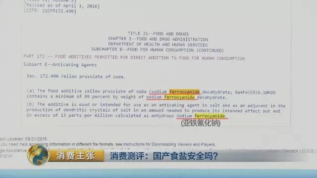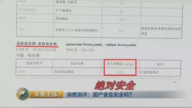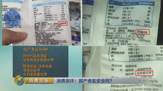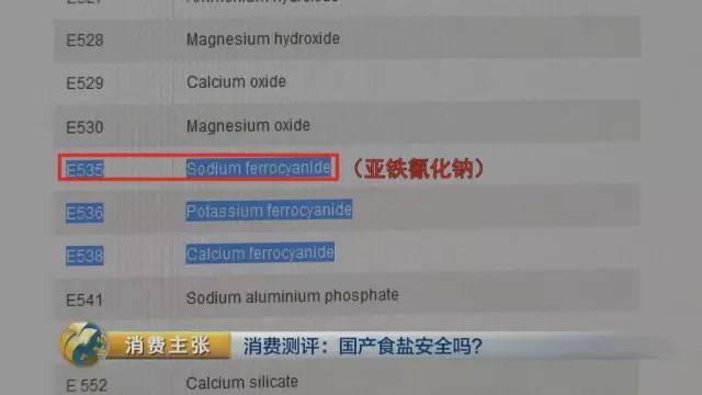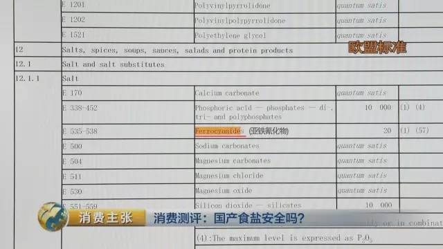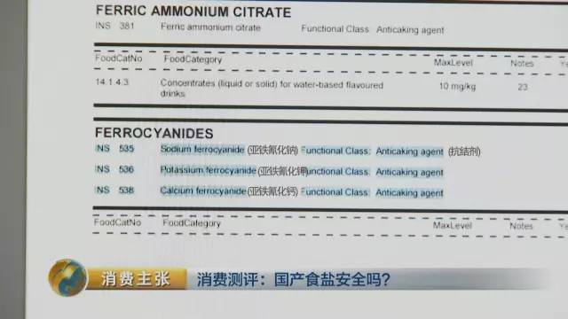 钟凯中华预防医学会健康传播分会常务委员:在国际标准当中,亚铁氰化钠、亚铁氰化钾、亚铁氰化钙都是可以用于食盐抗结,那么它还没有做限量规定,在美国标准当中,亚铁氰化钠是可以用于食盐抗结。