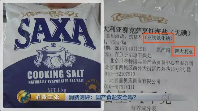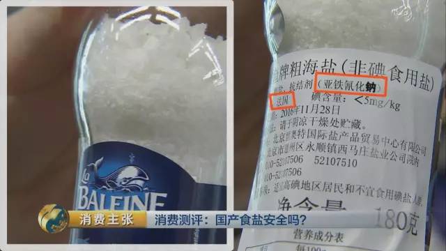 但是,记者也发现有来自4个国家的5款盐都添加了一种叫做亚铁氰化钠的抗结剂。他们分别是产于意大利的阳光细粒海盐、产于荷兰的莫盾牌无碘盐、产于法国的鲸鱼牌粗海盐180g和产于法国鲸鱼牌美国细海盐750g以及产于澳大利亚的亚赛克萨烹饪海盐。