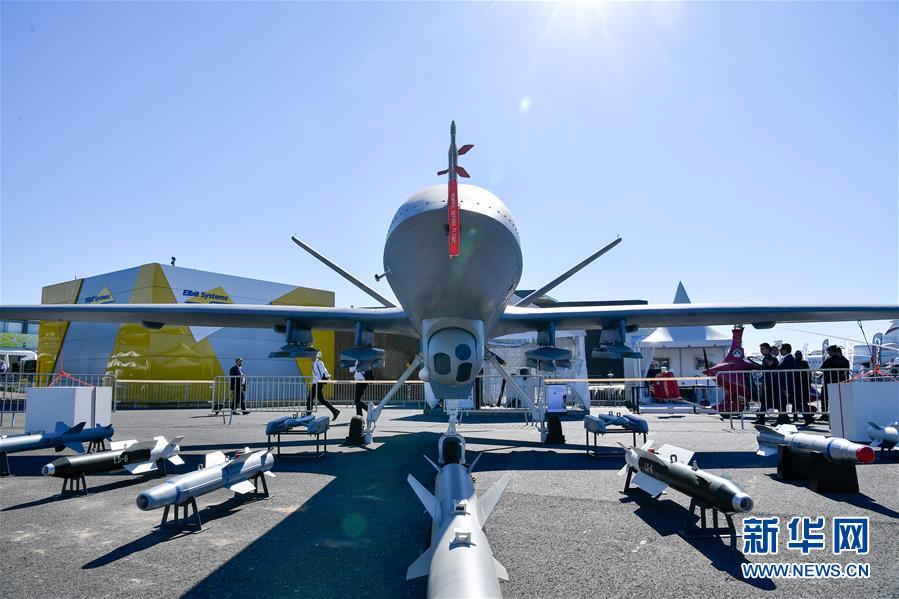 6月19日,在法国巴黎近郊的布尔歇,来宾参观中国航空工业集团公司带来的“翼龙II”无人机模型。