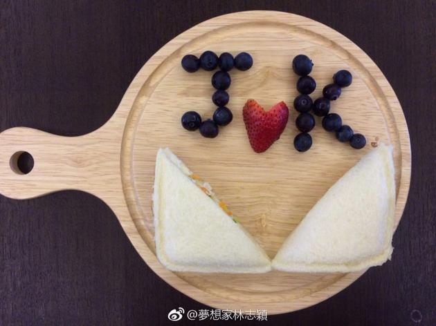 20日,林志颖更新微博晒出几张食物的照片,并配文“小朋友的爱心早餐:(地瓜+马铃薯泥)小黄瓜、红萝卜、水煮蛋、起司做成蔬菜沙拉三明治,看了好想吃喔!”照片中从食物原材料到成品出炉都有记录,三明治上面还有蓝莓并写了“J&K”,并用草莓做爱心,父爱满满。据悉,小志的双胞胎儿子名叫Jenson与Kyson,所以爱心早餐是准备给两个小家伙的没错啦!