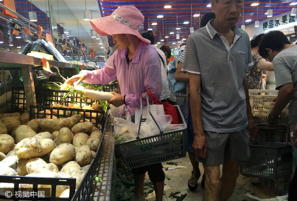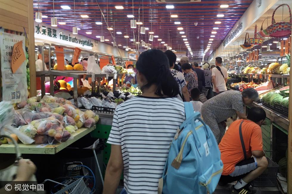 2017年6月21日,北京,暴雨天气来临前,市民在超市、菜市场忙采购。