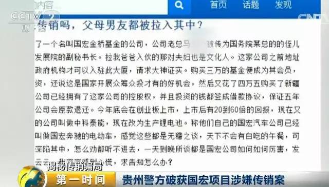 2016年4月份,贵州黔东南州警方在网上巡查中发现,很多人发帖对“国宏金桥基金”、“国宏众筹”等融资项目提出质疑。称这些项目许诺几十倍的高额回报,夸大公司业绩。多人已投入不少钱,并深陷其中。这个线索引起了警方的注意。