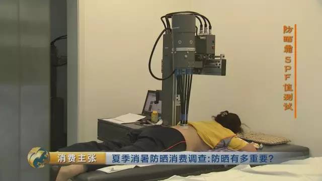 田燕中国人民解放军空军总医院皮肤科副主任医师:因为我们今天要测防晒化妆品,所以我们要用紫外线来照这个病人,日光中的紫外线怎么来,我们不能说用太阳直接来做试验,那我旁边这台机器呢,就叫做日光模拟器,这台机器经过特殊(光纤),通过特殊(光纤)以后,它可以输出能够模拟我们日光当中的紫外线,如果你到海边游玩,让你晒伤、皮肤晒红,其实最主要就是B段紫外线的作用,那么我们这个SPF值呢,也主要是防止这段紫外线。