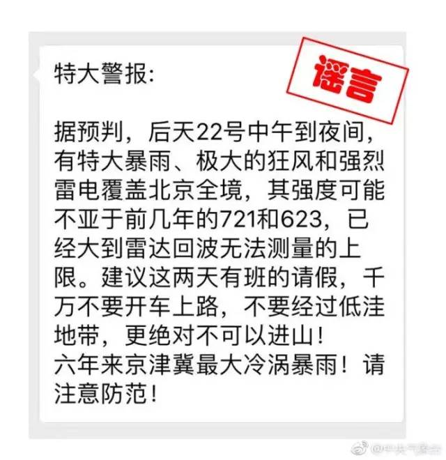 而针对网上流传的“北京将有特大暴雨、极大的狂风和强烈雷电覆盖北京全境”,@中国气象台回应称,这是谣言!