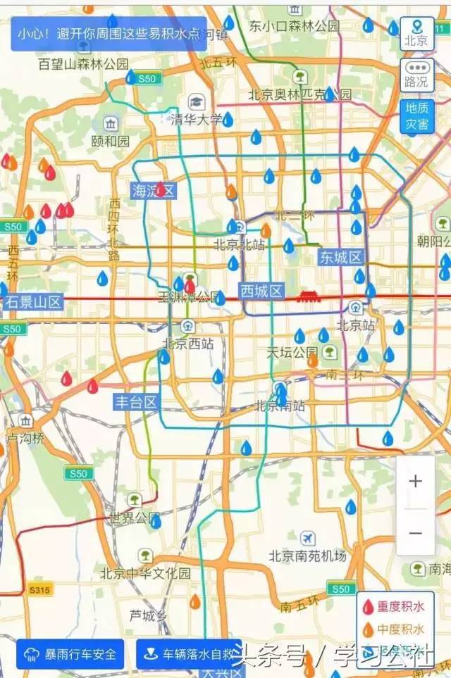 目前,百度、高德地图都可以实时查看查积水情况,如遇强降雨,打开手机导航搜索“北京积水点”就可即时查看道路情况。