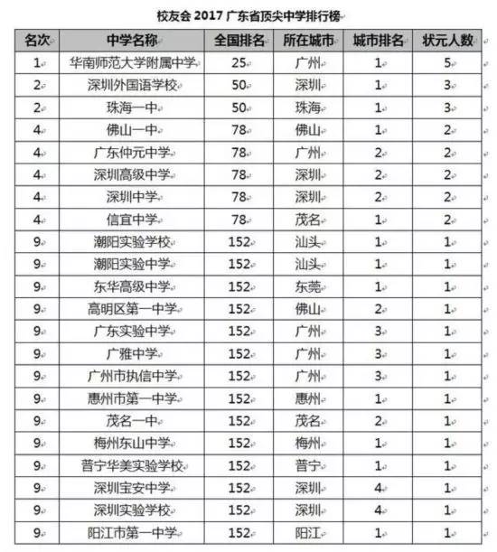 2017年6月19日,艾瑞深中国校友会网发布了最新的2017中国顶尖中学排行榜榜单,其中华南师范大学(分数线,专业设置)附属中学、深圳外国语学校、珠海一中、佛山一中、广东仲元中学、深圳高级中学、深圳中学、信宜中学名列校友会2017广东省顶尖中学排行榜前5强(有并列排名)。