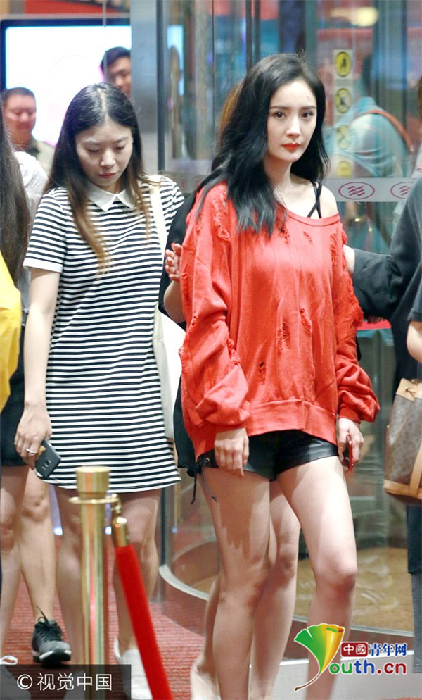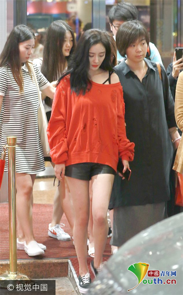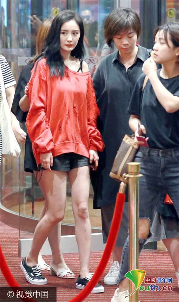 近日,杨幂现身某酒店。杨幂穿着黑色皮短裤,上衣大红色斜肩长袖,露出黑色内衣肩带。由于下大雨车子迟迟未到,杨幂在门口足足等了有十分钟,助理无奈只能站成人墙,把杨幂包围起来不让人围观,杨幂低头看手机打发时间。