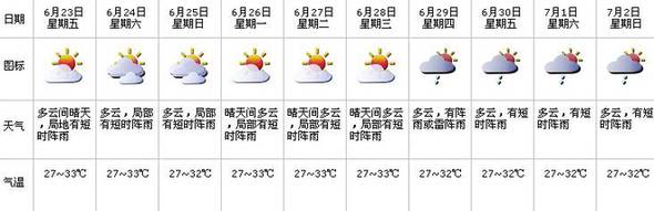 今日我市多云间晴天,局地有短时阵雨;气温27-33℃;西南风2-3级;相对湿度60%-90%。