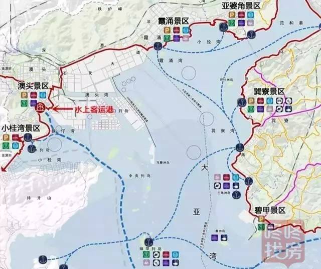 根据惠州市住建局最新公布《惠州市海岸带保护与利用规划》,大亚湾在澳头景区、霞涌景区、小桂湾景区、辣甲列岛、三门岛等旅游景区中规划了数十种娱乐游玩设施。包括住宿服务设施、餐饮服务设施、旅游咨询中心、海滨浴场、停车场等,其中澳头景区还规划有水上客运港。