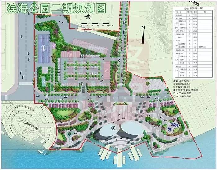 滨海公园二期项目总用地面积约4.8万㎡,由北侧临时停车场、南侧广场、公交首发站、客运中心、规划一路、规划五路组成。