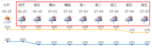 我市多云间晴天,局地有短时阵雨;气温28-32℃;西南风2-3级;相对湿度65%-95%