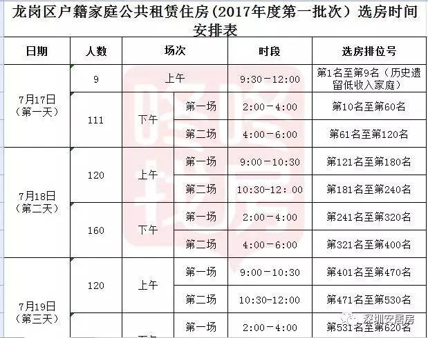 接下来是:龙岗区户籍家庭公共租赁住房(2017年度第一批次)选房时间安排表,请注意
