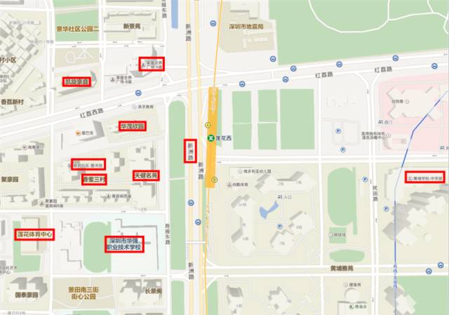 B 口: 华强职业技术学校 黄埔学校中学部 莲花体育中心 天健名苑 香蜜三村