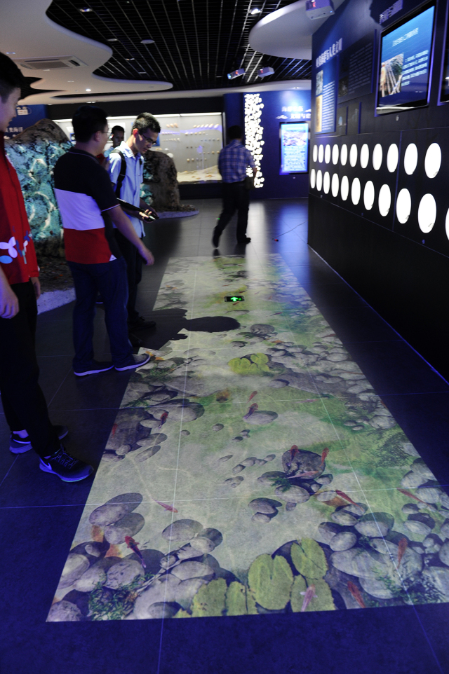 (地面触动互感应投影,脚一踩,鱼纷纷溜走)