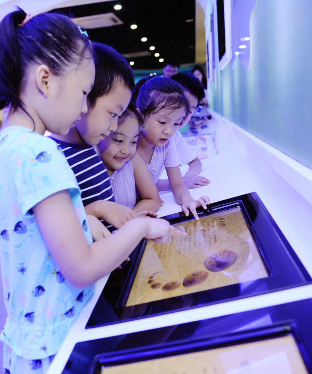 包括海底山石场景模拟、地面触动互感应投影及多媒体视频展示。其中,多媒体视频对贝壳与人的社会属性做了部分展示:贝壳与邮票、贝壳与建筑工艺、贝壳与美食和健康、贝壳与民间文学故事(田螺姑娘)等等。