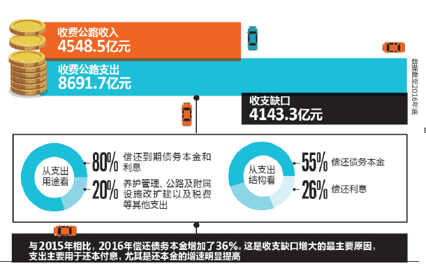 截至2016年年底,全国收费公路债务与2015年相比,净增加4061亿元,增长9.1%,债务规模越来越大。国家行政学院教授王伟表示,建设任务重,是债务越来越多的直接原因。新增债务主要是新建高速公路带来的,今后每年增加的债务可能会逐步回落。