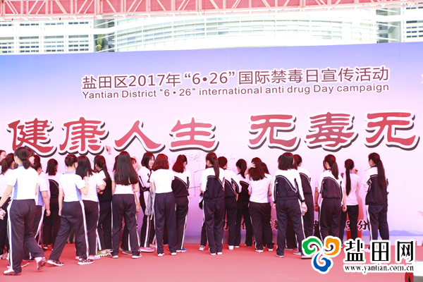 学校通过禁毒晨读、校园广播、LED电子显示屏、校园微信公众号推送、禁毒黑板报评比、校园宣传栏等多种形式,努力营造校园禁毒预防宣传良好氛围。6.26国际禁毒日当天正值周一,部分学校开展国际禁毒日主题班会、国旗下倡议宣讲等活动,盐港中学还组织学生到区行政中心广场参与盐田区2017年"6.26"国际禁毒日大型主题宣传活动,现场青少年学生纷纷在禁毒宣传墙上签名,表达与毒品斗争到底的决心,并积极参与禁毒知识有奖问答、禁毒互动游戏,通过寓教于乐的方式学习毒品知识。盐田实验学校则利用自身资源,邀请学生家长、社区亲子团体到校参观盐田区中小学校禁毒教育基地,开展“大手拉小手,共筑拒毒墙”禁毒宣传教育活动。