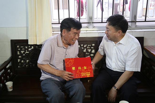 在沙头角社区老党员李进家中,吴德林说:“党的生日快到了!我们代表区委、区政府来看望您,传达组织的关怀,也感谢老党员为党、为国家、为人民所做出的贡献。祝您身体健康!”李进今年81岁,早在1957年便加入中国共产党,退休前为沙头角居委会主任,退休后,李进还一直支持社区工作,积极参与支部组织生活。