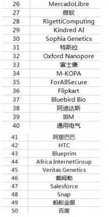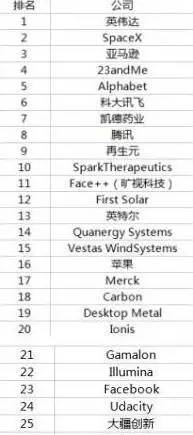 进入这一榜单的门槛非常高。首先,必须要有真正的创新技术;其次,还要有既实用又雄心勃勃的商业模式。上榜的中国公司有科大讯飞(第6名)、腾讯(第8名)、旷视科技(第11名)、大疆科技(第25名)、富士康(第33名)、阿里巴巴(第41名)、HTC(第42名)、蚂蚁金服(第49名)、百度(第50名)等共9所。这一数字为该榜单发布7年以来最高值。
