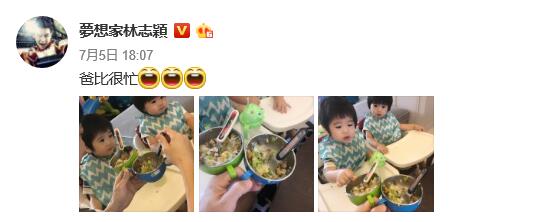 7月5日下午,林志颖晒出自己喂双胞胎儿子吃饭的萌照,并配文称:“爸比很忙”。照片中,林志颖手持两只小饭碗,精心地为两个儿子“进餐”,父爱爆棚!