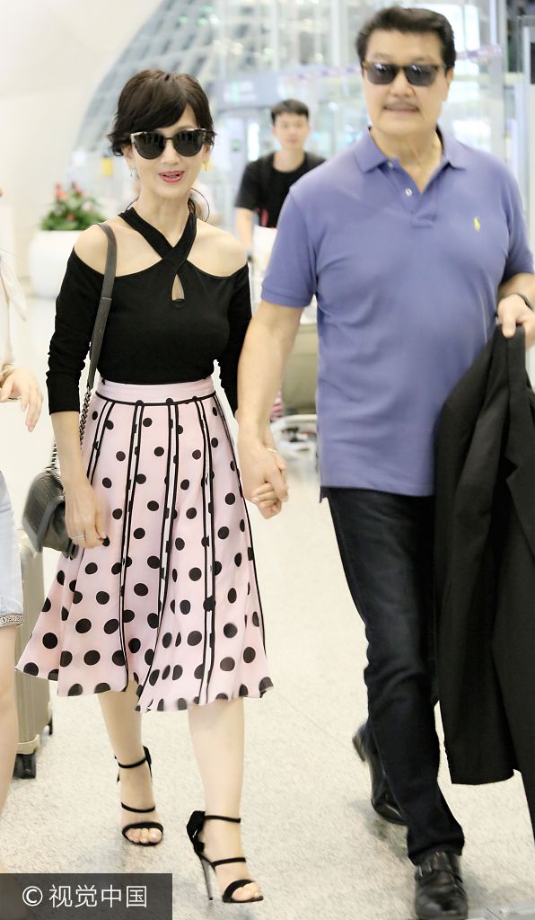 2017年7月10日讯,广东省深圳市,7月9日深夜,赵雅芝与老公黄锦燊现身深圳宝安机场,63岁的她身着黑色交叉露肩上衣,下身搭配淡粉色波点裙,走路带风气质非凡,完全看不出年纪!(视觉中国/图)