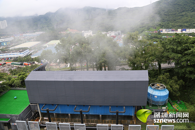 参观完室内后,记者来到5楼露天咖啡馆,从咖啡馆往下看,发现三个蓝色的圆形装置不断冒出白色水蒸汽,空中“浓烟滚滚”。这个“浓烟滚滚”的画面,曾被市民拍下来上传到网络上,用于投诉盐田垃圾发电厂危害市民健康。