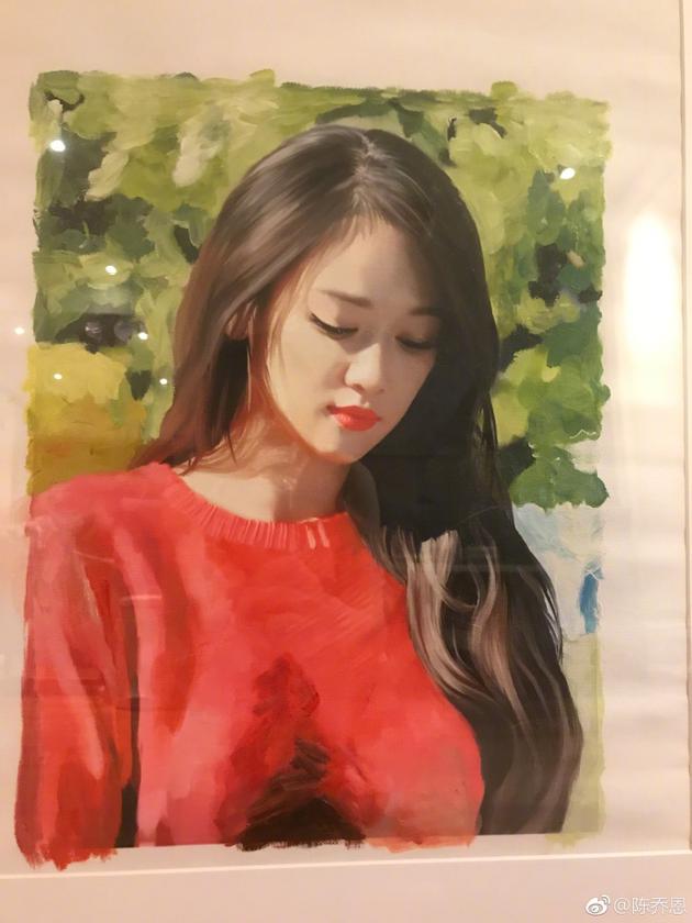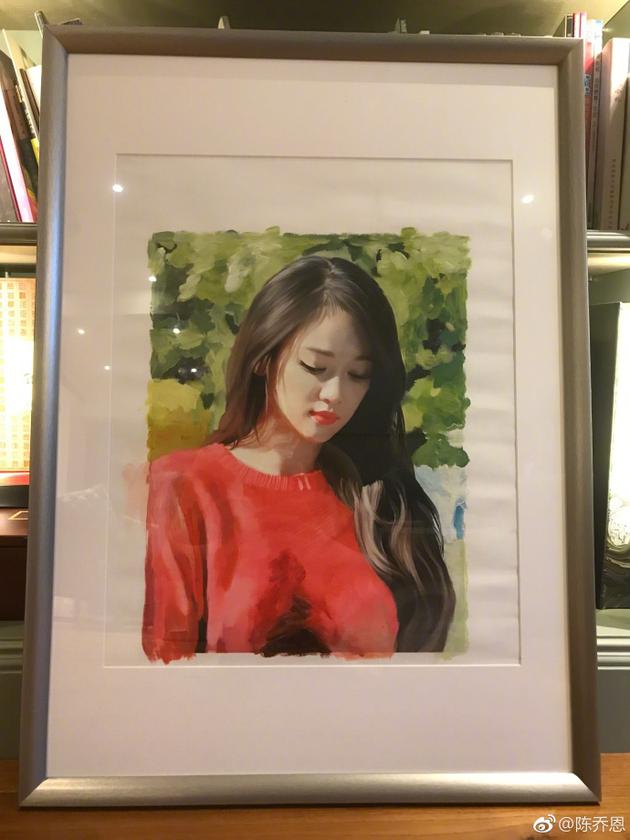 7月11日晚,陈乔恩通过微博晒粉丝送给她的自画像,并称:“哪位粉丝画给我的?好有才,加鸡腿,我会好好珍惜的,谢谢!”画像中,陈乔恩身穿红色圆领针织衫,披着一头长长的大波浪卷发,红唇白皙,眼睛微微低垂,清纯迷人,画的非常的逼真。