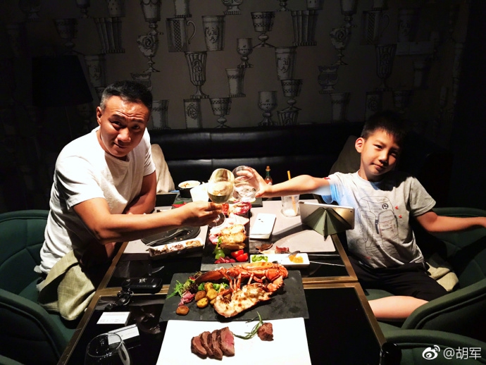 7月12日,胡军微博晒出与儿子康康合照,并配文“爷们儿的二人世界”。照片中两人面前龙虾烤肉一桌子美味,康康更是用美食当道具搞怪摆拍了起来,表情可爱搞怪逗笑众网友。