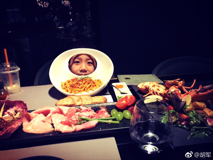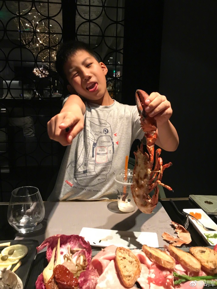 7月12日,胡军微博晒出与儿子康康合照,并配文“爷们儿的二人世界”。照片中两人面前龙虾烤肉一桌子美味,康康更是用美食当道具搞怪摆拍了起来,表情可爱搞怪逗笑众网友。