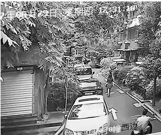 监控显示一男子骑着电动车尾随一女子。