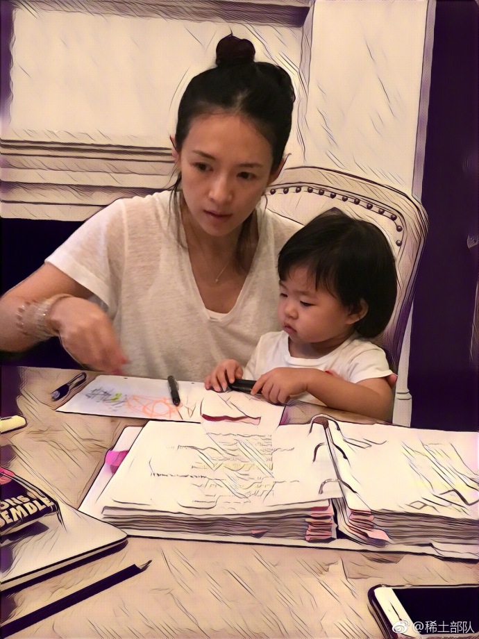 章子怡背台词不忘带娃 抱着女儿醒醒一起画画