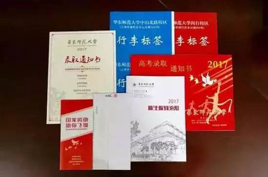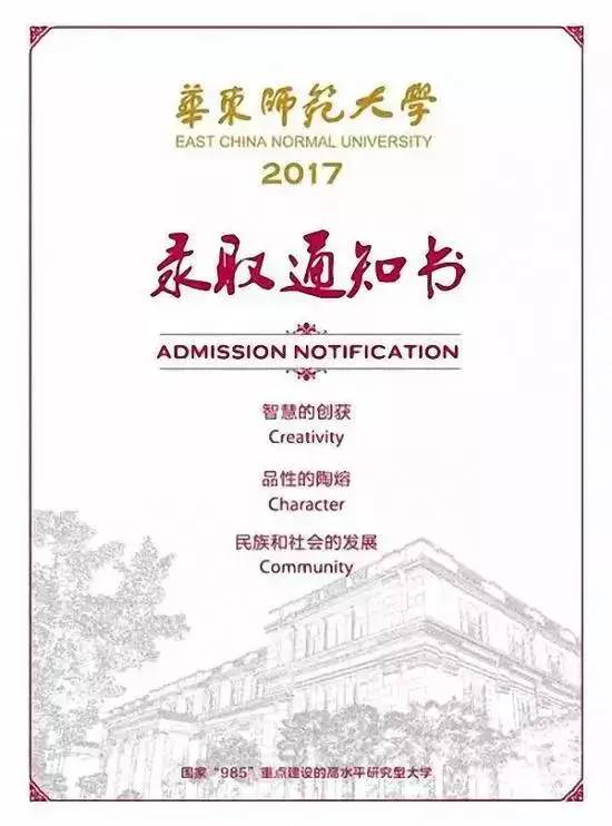 华东师范大学2017年高考录取通知书沿用往年竖版排版模式,浅色底、烫金字、素描化图案,采用了中山北路校区文史楼的图案素材。