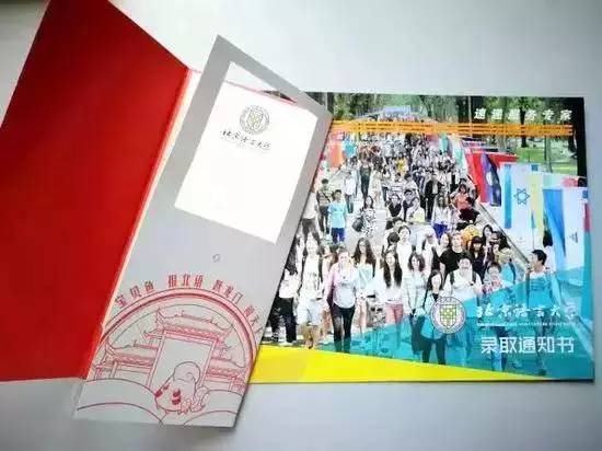 北京语言大学2017年录取通知书两分式的装帧取“云开方见日”的寓意。外封选取橙色作为主色调,代表着北语对新学子大学生活的美好祝愿,成为欢快活泼如橙色般温暖的人,而浅色的底纹则代表了象牙塔的纯洁与学术的清净。