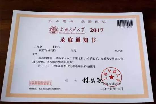 在录取通知书的反面,不仅有校训、校徽,还印写着“千里之行,始于足下,交通大学将成为你放飞梦想,谱写绚烂华章的地方”。