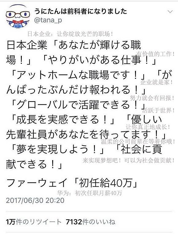 这一人才策略果然起到了不错的效果,华为招聘轻松登上了日本的热门话题榜。日本国民惊叹于中国企业的大手笔,纷纷评论“一般人都想去华为工作”、“看来优秀人才要流走了”。一名日本网友发推写了一条对比口号型日企和华为的段子,得到了一万次以上的转发和点赞。