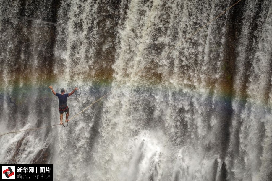 2016年4月5日报道(具体拍摄时间不详),巴西蓬蒂诺瓦,摄影师Bruno Graciano的这组照片融合了美妙的光、独特的构图和惊险的时刻。Bruno拍下了挑战者Riginaldo Gomes走过烟瀑布(Waterfall of Smoke)的惊险场景,而光照和瀑布在Riginaldo身后绘成了一条美丽的彩虹。